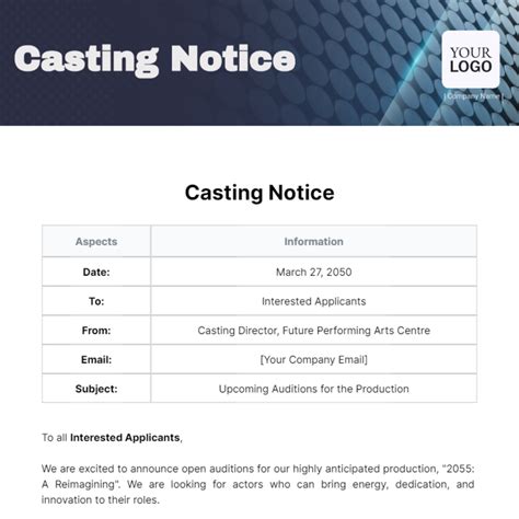 Casting Notice Template - Enhance this design & content with free ai. Casting notice is in editable, printable format. Create free casting call notice flyers, posters, social media graphics and videos in minutes. Create free casting notice flyers, posters, social media graphics and videos in minutes. We’ve catered to the diverse needs of the industry by providing a comprehensive collection of audition form templates.